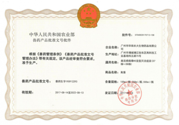 2017年8月14日,由華南農業大學、中國獸醫藥品監察所、廣州市華南農大生物藥品有限公司(以下簡稱“華南生物”)共同研發的禽流感病毒H5亞型滅活疫苗(D7株+rD8株)通過農業部獸藥產品批準文號的審批,喜獲得農業部核發的獸藥產品批準文號——獸藥生字190912293;商品名:禽盾